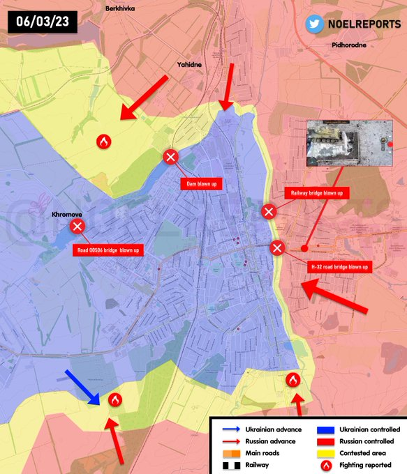 在城市的正面,目前已经确认,乌军已完全从巴赫穆特东部撤到Bakhmutovka河以西,瓦格纳昨天将她的旗帜插在Zabakhmu的T-34纪念碑上,宣示对这一地区的控制权。