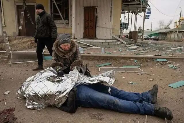 乌克兰东部城市康斯坦丁诺夫卡,66 岁的尼娜·科瓦连科在儿子尸体旁痛哭不止。