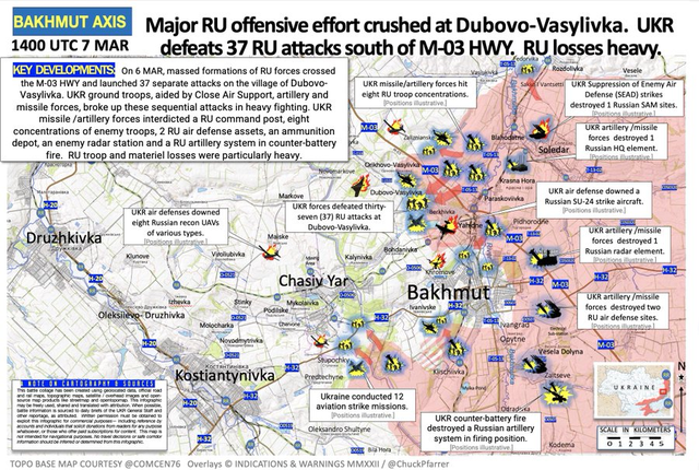 在焦点战场巴赫穆特,俄军昨日在Dubovo-Vasylivka村发起了大规模的攻势,乌军地面部队、炮兵和导弹部队在激战中击退了俄军的37次进攻。