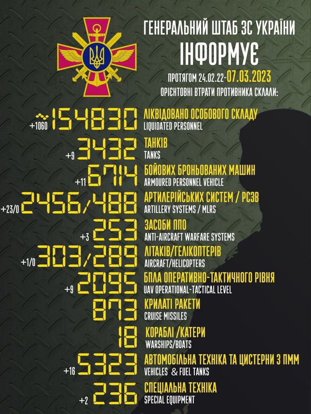 昨日俄军在各条战线上共计减员1060人,此外还有9辆坦克、11辆装甲运兵车、23门火炮、3套反坦克系统,以及9架无人机、1架固定翼飞机遭摧毁。