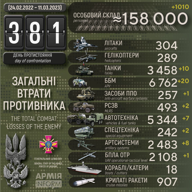 昨日俄军在各条战线上共计减员1010人,此外还有10辆坦克、20辆装甲运兵车、8门火炮、以2套多管火箭炮遭摧毁。