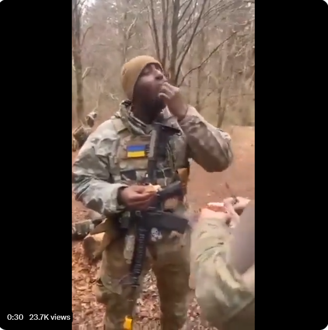 一位黑人国际志愿军士兵带着微笑在前线和战友一起品尝三文鱼。