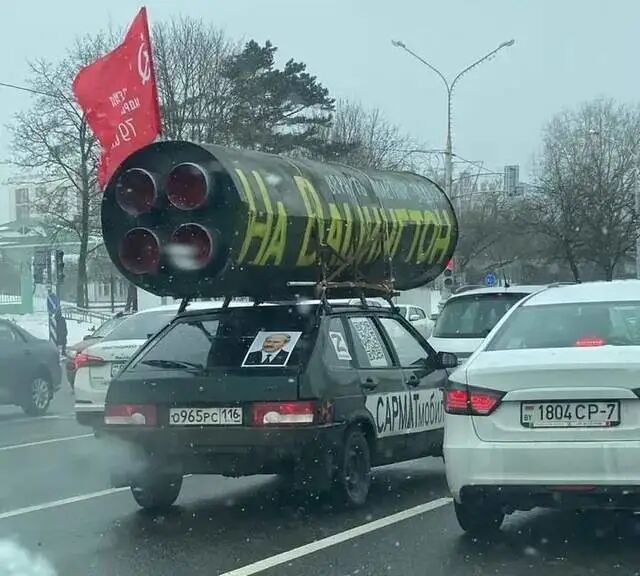 在白俄罗斯明斯克,一辆老式的俄罗斯拉达车车顶上装着洲际导弹,上面刻有“射向华盛顿”的字样。