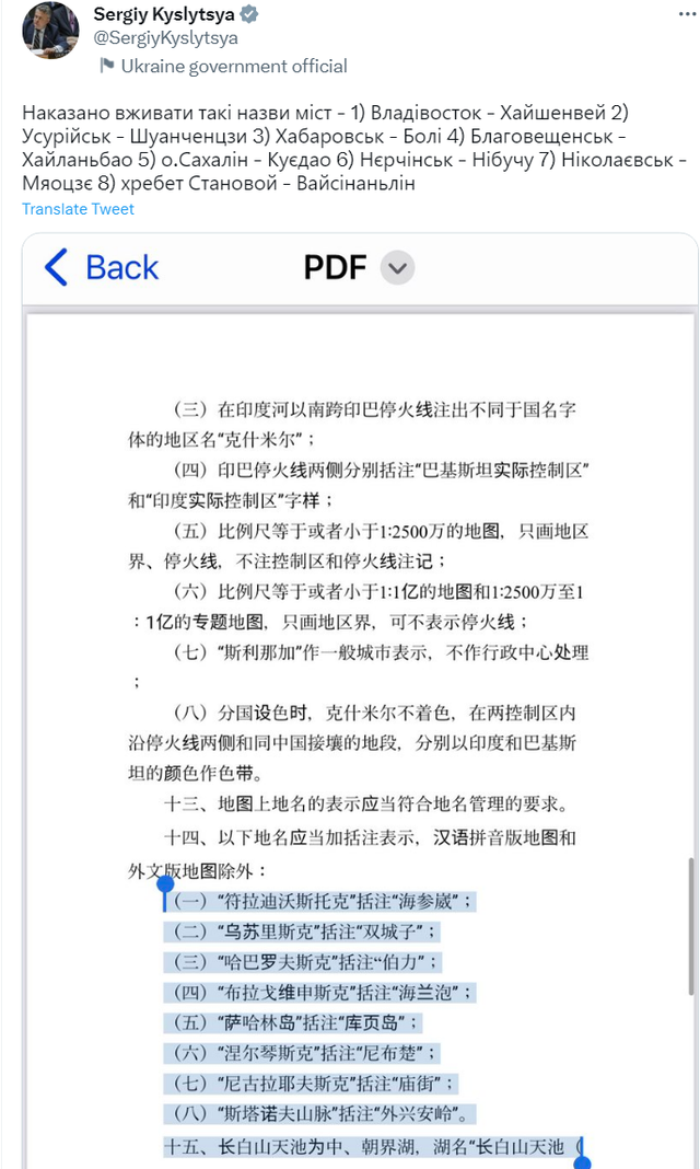 乌克兰驻联合国大使表示俄罗斯历来侵略成性,并列举了一些被俄罗斯非法占领的大国领土名称,包括:"海参崴"、“双城子”、 “伯力”、 “海兰泡”、 “库页岛”、 “尼布楚”、“庙街”、 "外兴安岭"。
