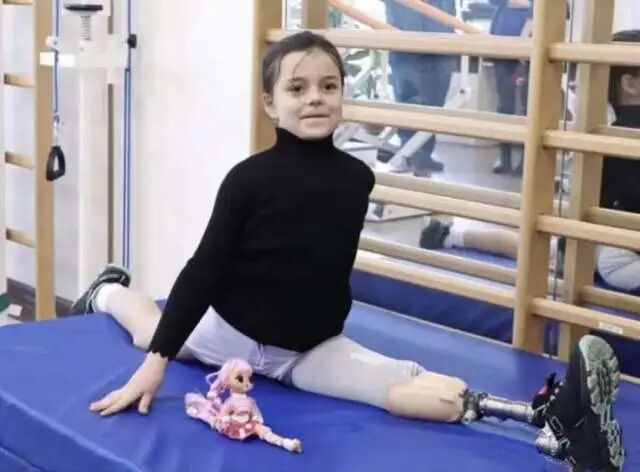 6岁乌克兰体操运动员 Sasha Paskal 在俄罗斯对敖德萨的导弹袭击中失去了一条腿,经过几个月的康复治疗,她现在已经恢复了体操训练。