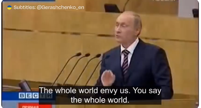 普京在演讲中表示,"全世界都在嫉妒俄罗斯,我们有贫困,但是国家很稳定。"