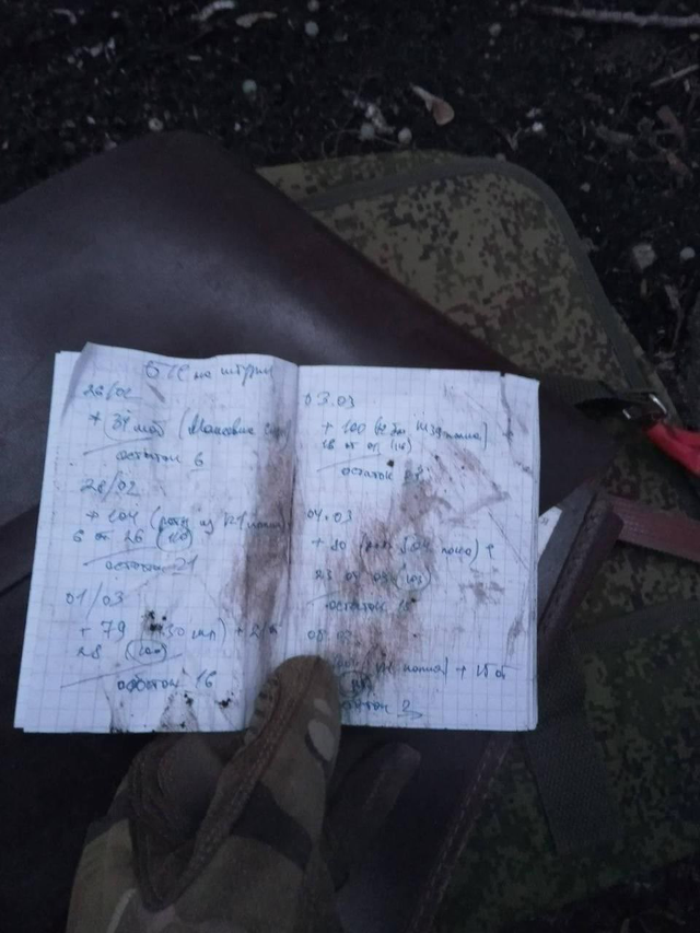 在弗勒达(Vuhledar)一个阵亡的俄军官身上找到的一个“账本”。上面带圈的数字是记载着执行突击任务的人数,下面是回来的人数。