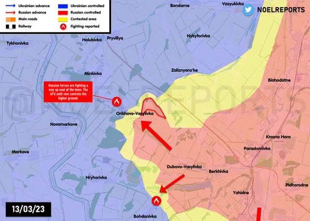 在具体的战况上,巴赫穆特北面的俄罗斯军队正在向高地作战,不过至今还没有成功。Orikhovo-Vasylivka西部的整个山脊明显较高,这给了乌克兰人一个防御优势。