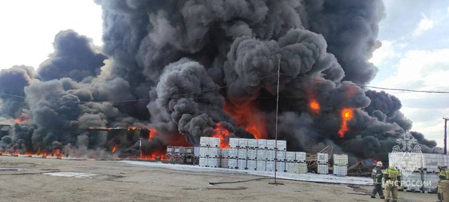 在俄罗斯联邦下诺夫哥罗德州捷尔任斯克,一家化工企业的仓库起火,着火面积4000平方米。