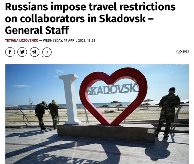 在南线,乌克兰武装部队总参谋部在‘非死不可’上称,“截至4月18日,在赫尔松州斯卡多夫斯克市,俄罗斯占领者开始强迫所有合作者和与他们合作的人签署禁止他们出去旅行的承诺。”