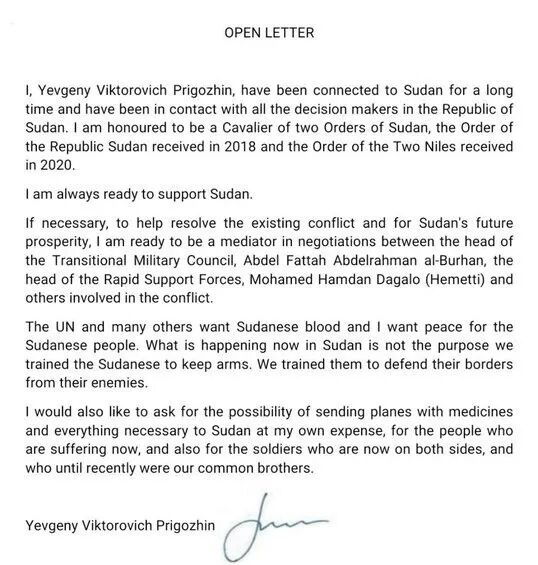 瓦格纳头子发表了一封公开信,表示愿意担任解决苏丹冲突的调解人。
