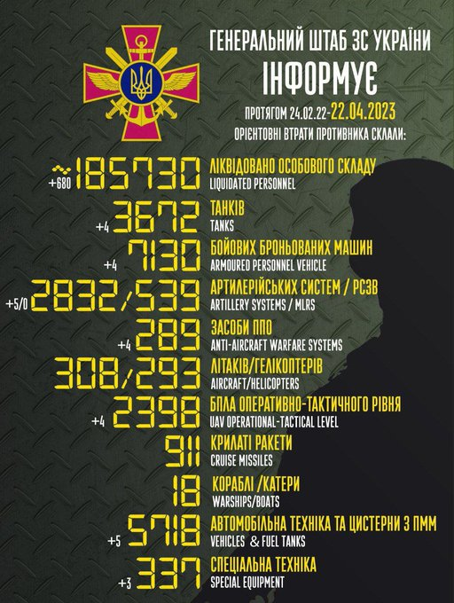 昨日俄军在各条战线上共计减员680人,并有4辆坦克,4辆装甲运兵车,5门火炮,以及4架无人机、4套反坦克系统遭摧毁——实际上根据晚间的报道,乌克兰国防军还击落了1架米-24直升机。