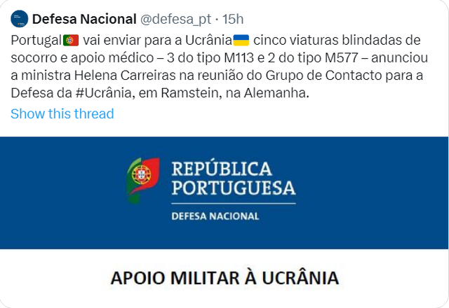 葡萄牙证实将向乌克兰再转移2辆M577指挥和参谋车辆和3辆M113装甲运兵车。