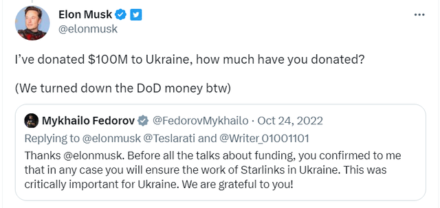 马斯克回应称,自己已经捐了1亿美元给乌克兰了。