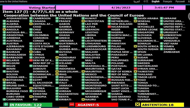 联合国大会以122票“赞成”和5票“反对”通过了关于联合国与欧洲委员会合作的决议。俄罗斯联邦试图让大会取消提及侵略乌克兰的内容,但以失败告终。