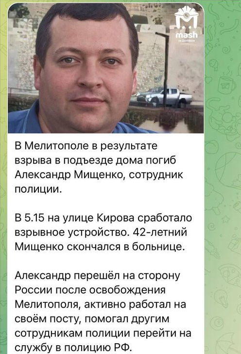 昨日,梅里托波尔市警察局副局长,42岁的alexandermishchenko在自己的车中被乌敌后游击队炸死。他的同事yuriy也被炸伤。