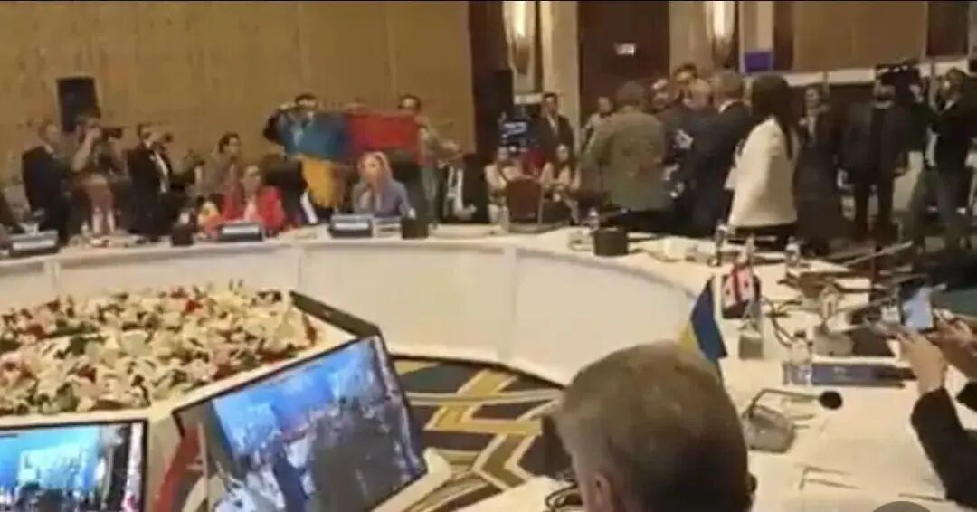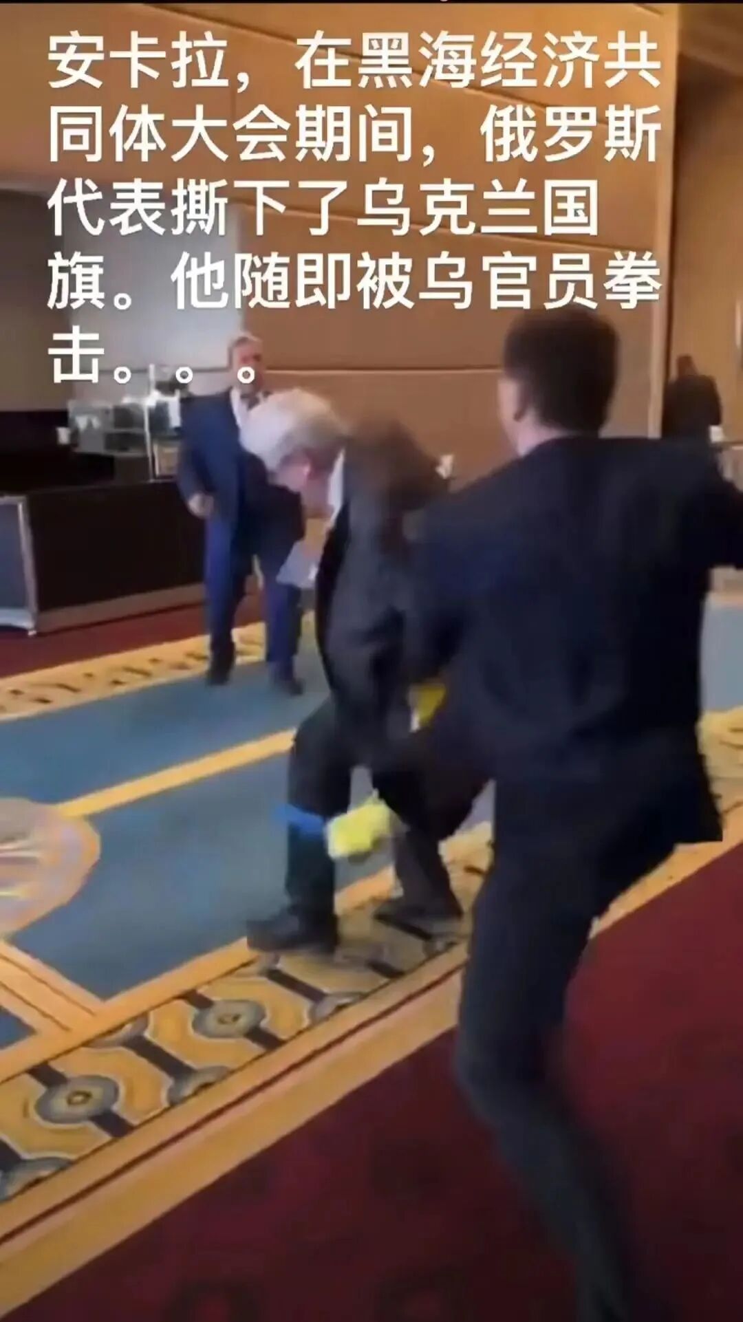 在黑海经济共同体大会上,一位俄罗斯代表因扯下了会场的乌克兰国旗,被乌克兰的一位少壮派议员给揍了。