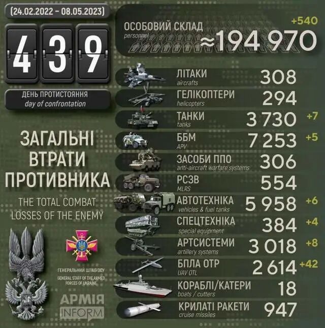 根据乌总参的报告,昨日俄军在各条战线上共计减员540人,并有7辆坦克,5辆装甲运兵车,8门火炮以及44架无人机遭摧毁。
