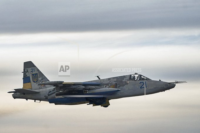 第一张乌克兰空军苏-25的清晰照片,它携带美国提供的Zuni 5-in非制导导弹,装载在LAU-10的4个弹药舱中。
