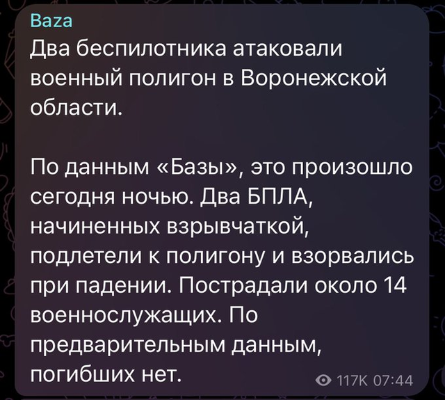 乌军两架无人机袭击了俄罗斯沃罗涅日地区的一个军事训练场。据BAZA称,两架装满炸药的无人机飞到一个训练场,在坠落过程中爆炸,造成约14名军人受伤。