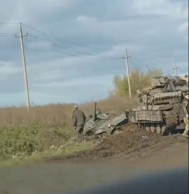 在一个视频中,一辆乌克兰坦克试图从泥泞中拔出BMP-2。地点在在Konstyantinivka和巴赫穆特之间的公路某处。