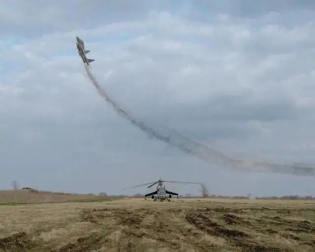 乌克兰Mi-24P攻击直升机和一架MiG-29战斗机的精彩瞬间,机翼下挂着美国AGM-88 HARM反辐射导弹。
