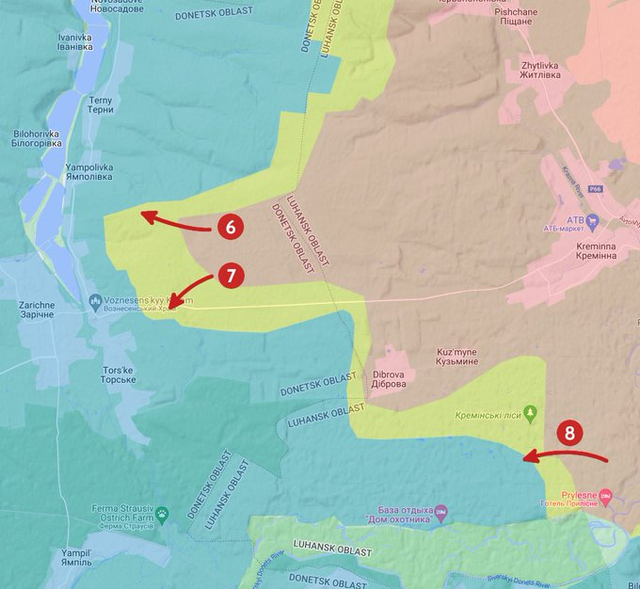在克里米纳附近,俄军一直在攻击Yampolivka(6)、Torske(7)和Serebranka森林(8),但收效甚微。过去几个月,乌军在克里米纳尤其是森林地带建立了牢固的阵地,俄军的进攻有点打卡交差的感觉。