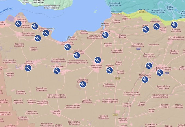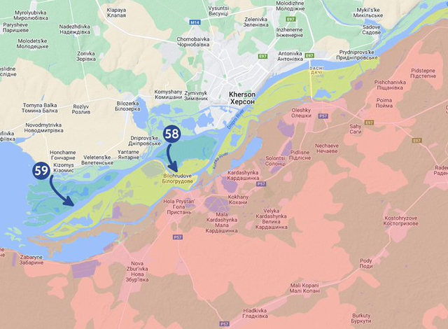在赫尔松方向,过去几周里,乌克兰已经攻击并控制了第聂伯河左岸的几个岛屿(58,59)。俄罗斯一直试图用炮火和空投炸弹击退这些行动,但没有成功。