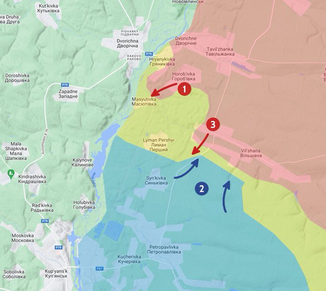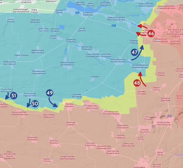 在武勒达尔附近,乌军正在缓慢地穿过灰色地带,向帕夫利夫卡(49)、新迈奥尔西克(50)和新东涅茨克(51)推进。