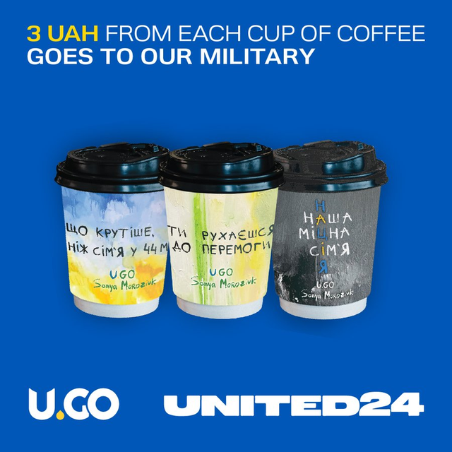 乌克兰加油站开始售卖由乌克兰艺术家Sonia Morozyuk绘制了杯子图案的饮料,每份饮料会捐赠3UAH给乌克兰军队。