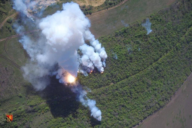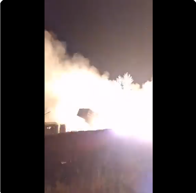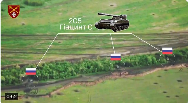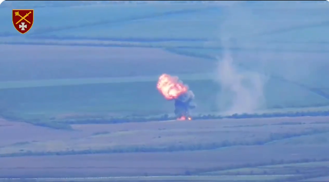 第44炮兵旅的无人机发现了3架俄罗斯2S5 Giatsint-S SPGS。随后招来炮火,击中了中间的SPG,巨大的爆炸和冲击波,连带右边的SPG一并摧毁了。