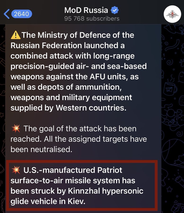 在俄罗斯宣布“匕首”摧毁了爱国者防空系统之后,乌克兰空军发言人伊格纳特呼吁大家不要担心爱国者防空系统的命运,他指出,用一枚导弹摧毁这一系统根本就不可能的,因为爱国者是一个复合体。它有一个指挥中心,雷达和多达8个发射器,彼此分散,保持一切一定的距离。