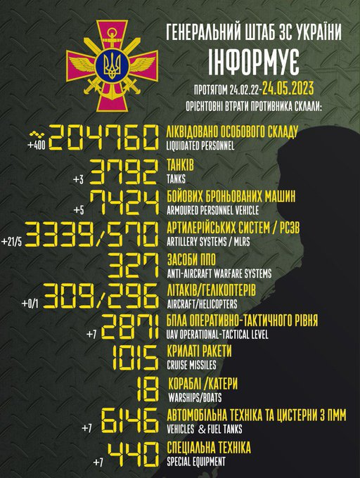 根据乌总参的报告,昨日俄军在各条战线上共计减员400人,此外还有3辆坦克、5辆装甲运兵车、21门火炮、5门多管火箭炮,以及1架遭摧毁。