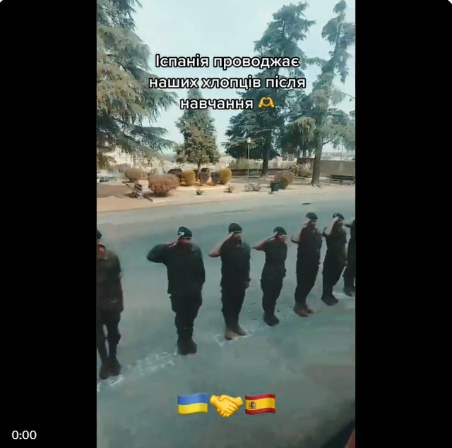 西班牙军事教官送别完成训练,准备返回乌克兰参战的乌军士兵。