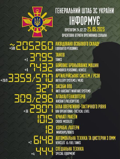根据乌总参的报告,昨日俄军在各条战线上共计减员500人,此外还有3辆坦克、8辆装甲运兵车、20门火炮、以及前文提到的36架无人机遭摧毁(su-25被击落时间较晚,没有进入统计数据)。