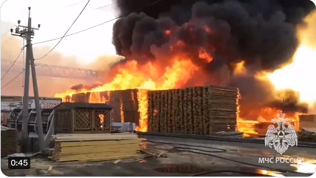 在俄罗斯车里雅宾斯克,一个木材仓库着火,过火面积2600平方米。