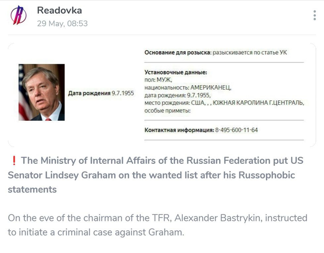 俄内政部悬赏缉拿美国参议员林赛·格雷厄姆,后者在与泽连斯基总统会面时称俄罗斯正在死亡,给乌克兰的援助是美国花过的最值的钱。