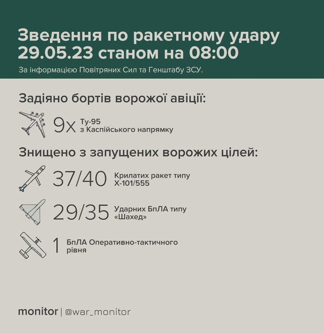 除了导弹之外,乌克兰防空部队还击落了35架俄军无人机中的29架。