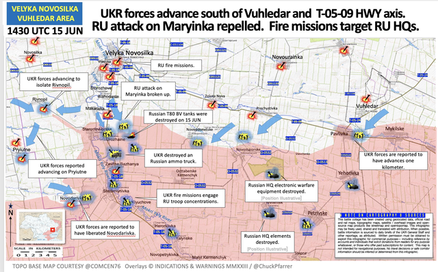 在大诺沃西尔卡方向,昨日乌军从武勒达尔向南推进了1公里,与东侧T-05-09 高速公路沿线向南推进的乌军对帕夫利夫卡(Pavlivka)形成了半包围之势。