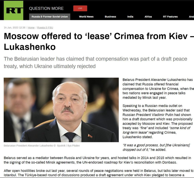 卢卡申科昨日向克里姆林宫投下重磅炸弹。他在接受声称,莫斯科曾向基辅提出“租借克里米亚”,并赔偿乌克兰战争损失的和平草案,但遭到了泽连斯基的拒绝。