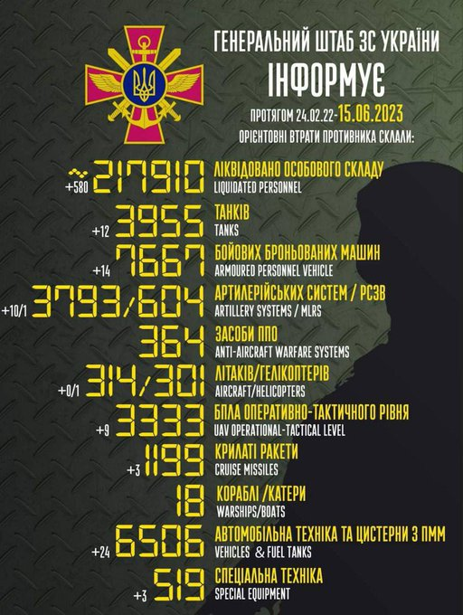根据乌总参的报告,昨日(6.15)俄军在各条战线上共计减员580人,并有12辆坦克、14辆装甲战车、10门火炮、1套多管火箭炮,以及1架Ka-52遭摧毁。