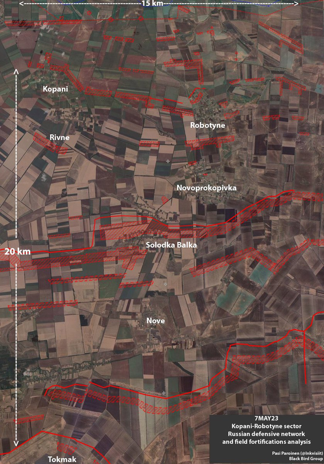 第一道防线——纵深2—3公里。连队壕沟和据点沿主要地形特征连续布置,Kopani和Robotyne的村庄构成了这一位置的关键阵地