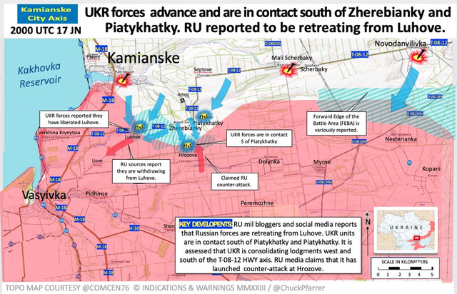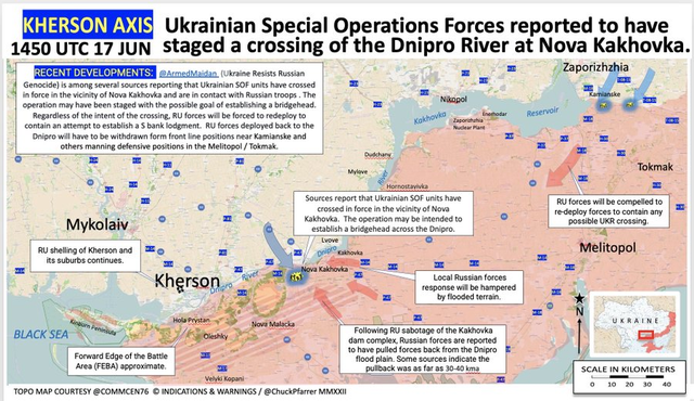 在赫尔松方向,乌克兰特种部队在新卡霍夫卡附近渡过第聂伯河。这次行动可能是为了建立一个桥头堡。俄罗斯部队将被迫重新部署兵力,以遏制乌军的行动,大坝算是白炸了。