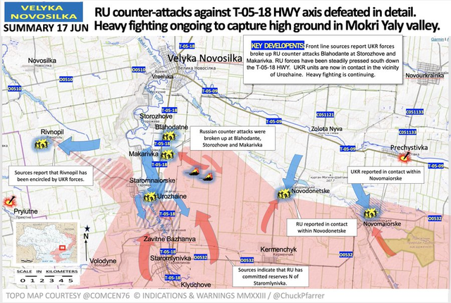 在扎波罗热东线,也即大诺沃西尔卡方向,乌军沿着新达尼利夫卡,罗伯济涅线继续向南进攻。与此同时,他们还在 Blahodante、Storozhove 和 Makarivka 击溃了俄罗斯人的反击。