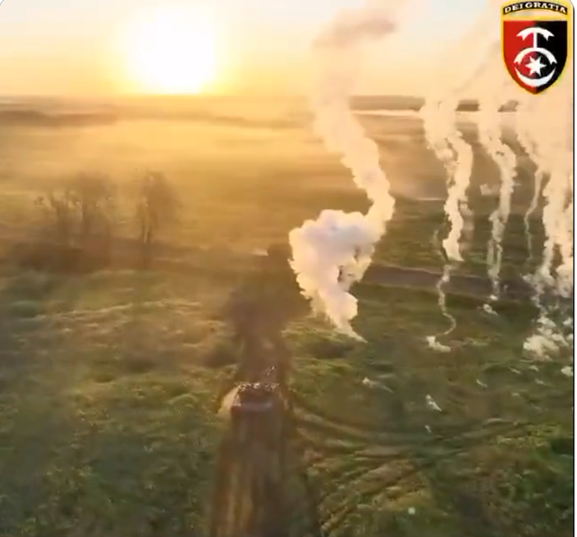 黎明时分,乌克兰的两辆坦克,迎着刚刚升起的太阳,袭击俄罗斯阵地。俄军试图用反坦克导弹瞄准其中一辆坦克,但没有成功。