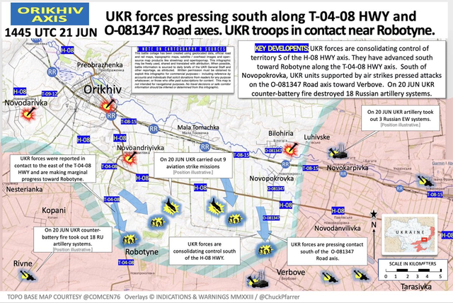在托克马克方向,乌克兰武装部队牢牢地控制住了H-08 高速公路的南部,并沿着T-04-08公路轴线向Robotyne推进。此外,在Novopokrovka以南的乌军,正在O-081347公路轴线上向Verbove发动攻击。
