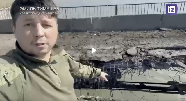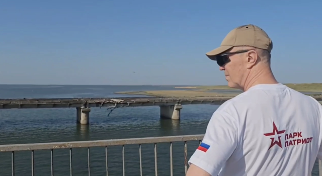 俄罗斯宣传人员展示了据称乌克兰袭击对琼哈尔大桥造成的破坏。据他们称,主桥和平行退役的旧桥均遭到袭击,桥梁受到的损坏看起来与去年秋天赫尔松战役中海马斯袭击安东诺夫大桥时造成的损坏相似。