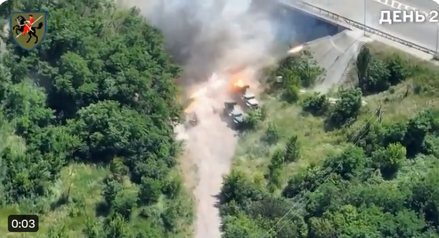乌军无人机在顿涅茨克地区发现三架俄罗斯 Bm-21 Grads 火箭炮,并招来炮火摧毁了它们。
