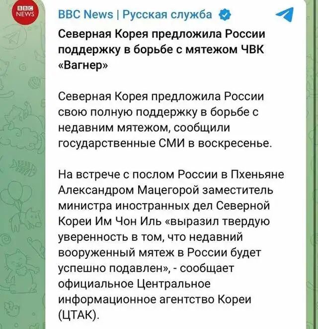 朝鲜副外长任正日在平壤会见俄罗斯大使时,“表达了对俄罗斯近期武装叛乱将被成功镇压的坚定信心”。