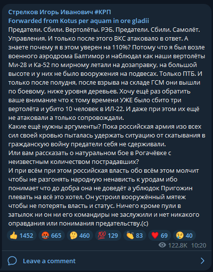 斯特列科夫要求给普里戈津和瓦格纳PMC指挥官“后脑勺一颗子弹”,“没有理由原谅或理解他们的背叛”。
